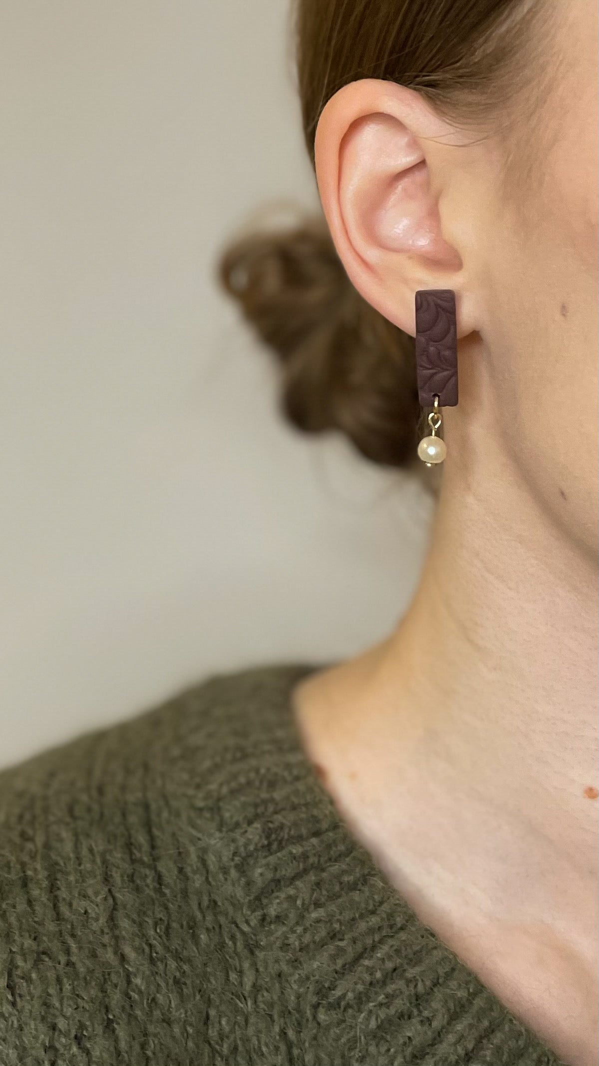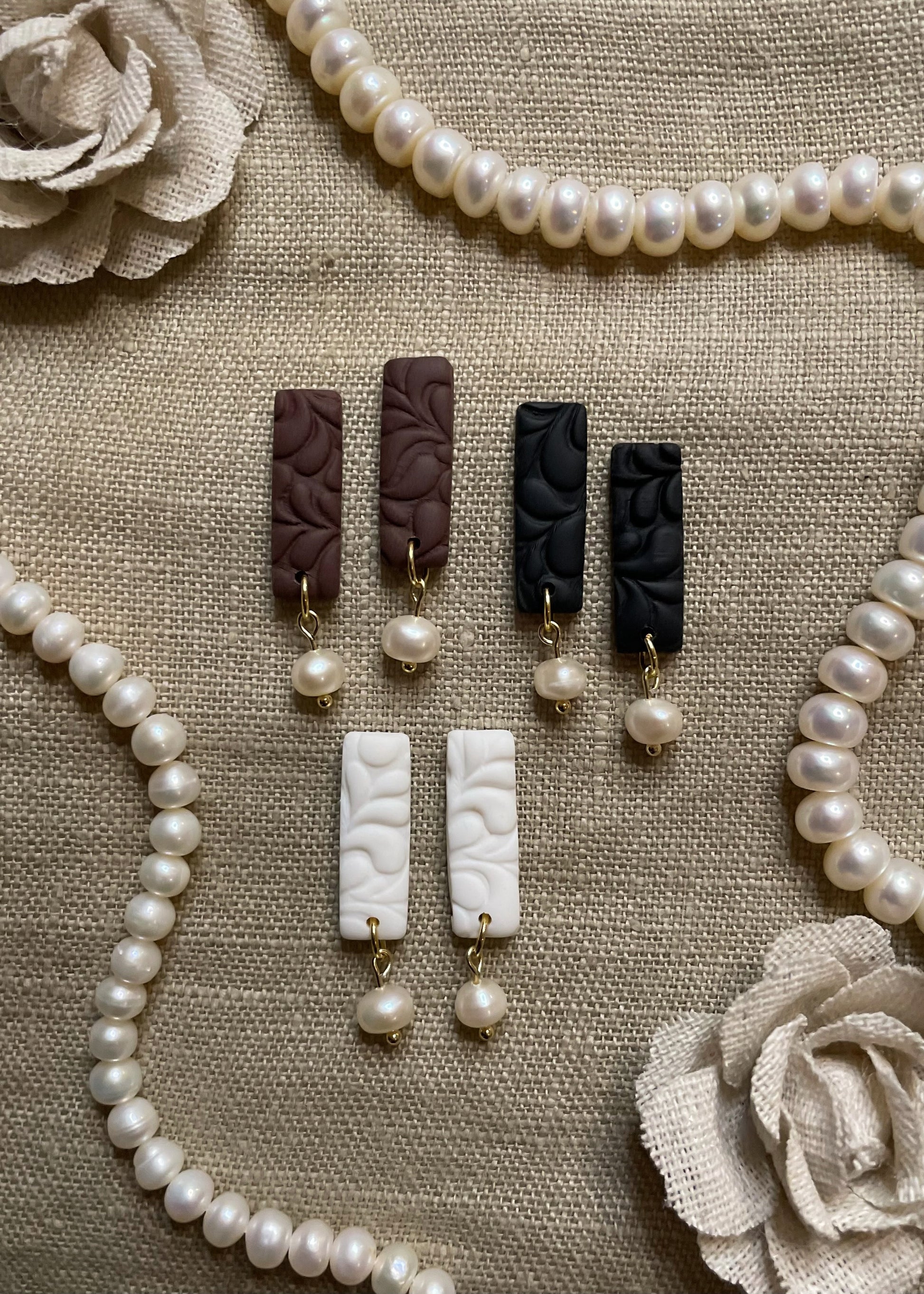 Hilma — yksinkertaista kauneutta. Nappikorvakorut, joissa kohokuvioitu polymeerimassa ja aito makeanvedenhelmi yhdistyvät. Hilmat ovat höyhenenkevyet ja sirot, täydelliset arkeen ja juhlaan.