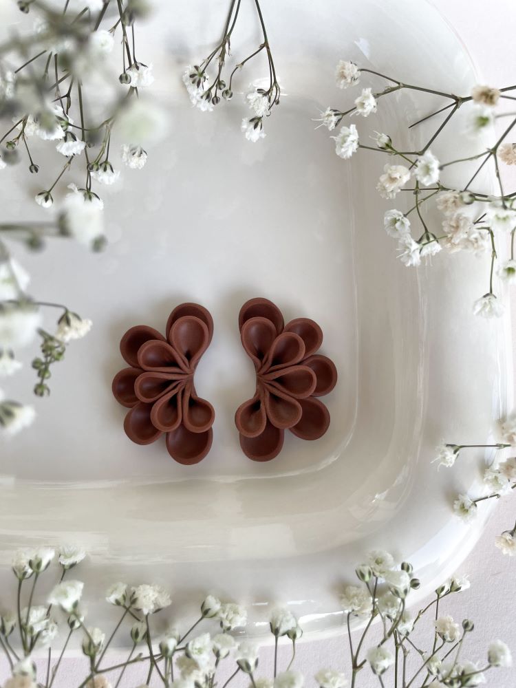 Tässä korussa keveys, kauneus ja persoonallinen muoto yhdistyvät. Jokainen terälehti on muotoiltu käsin polymeerimassasta, yksi kerrallaan - siksi jokainen pari on ainutlaatuinen.