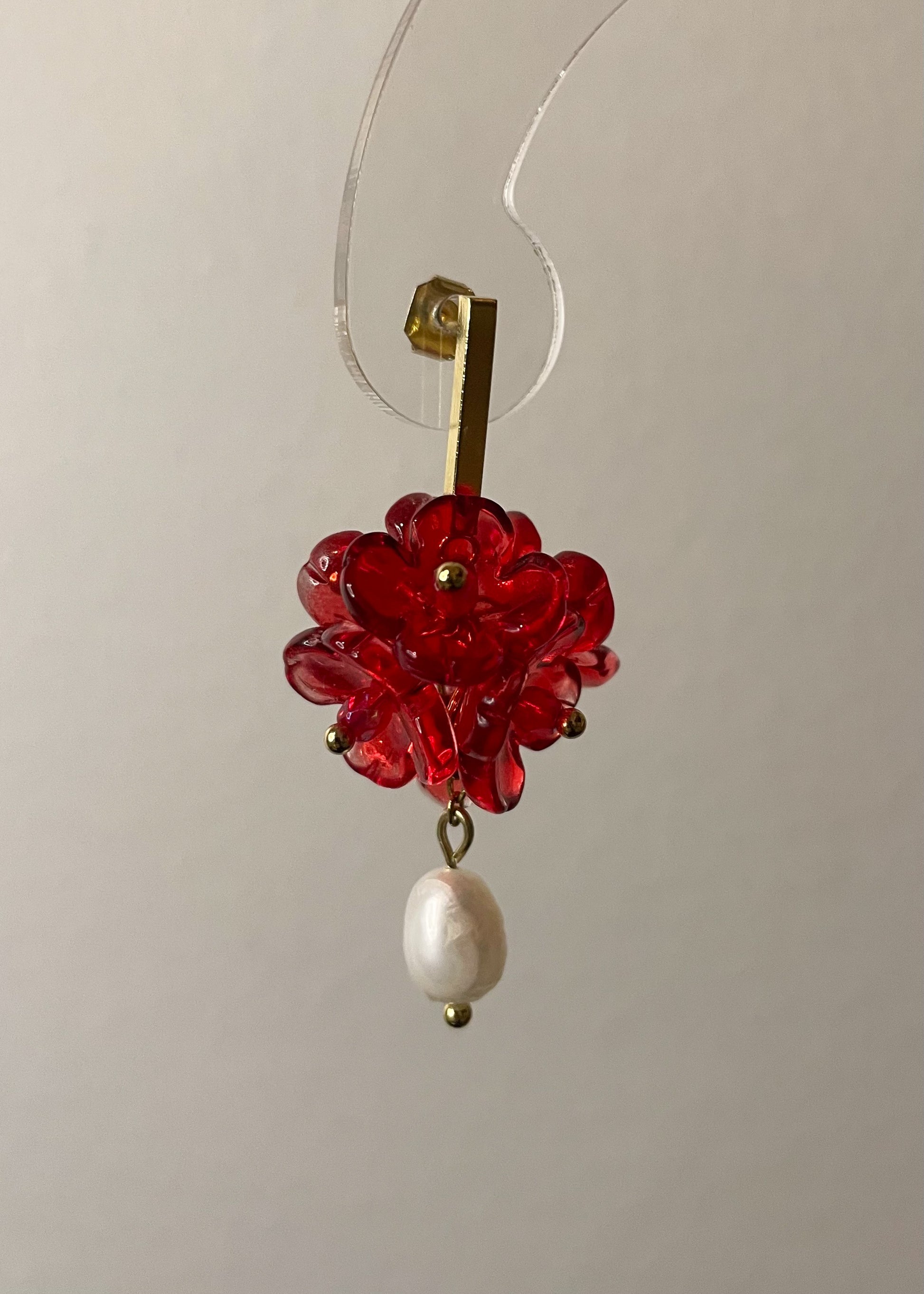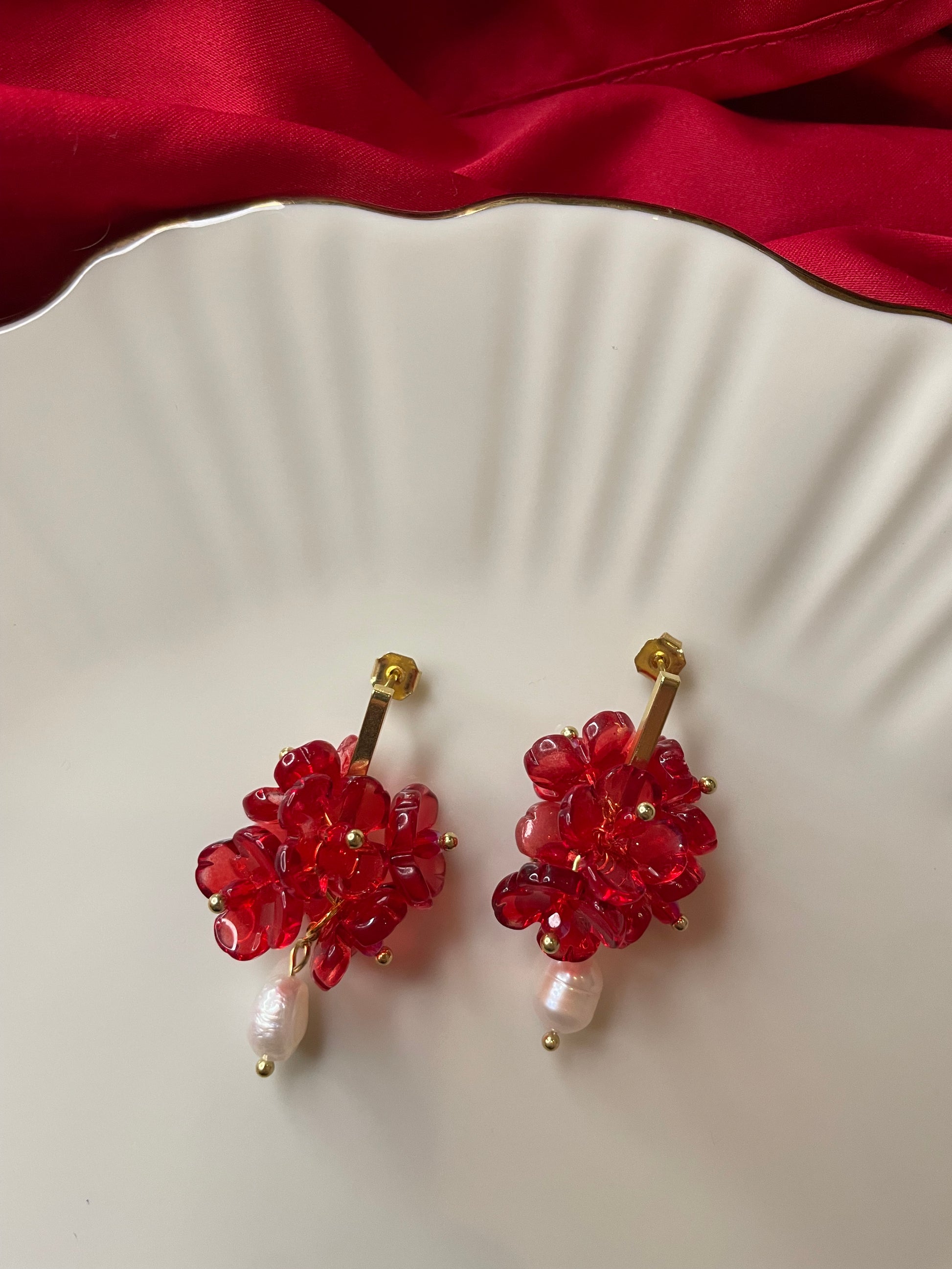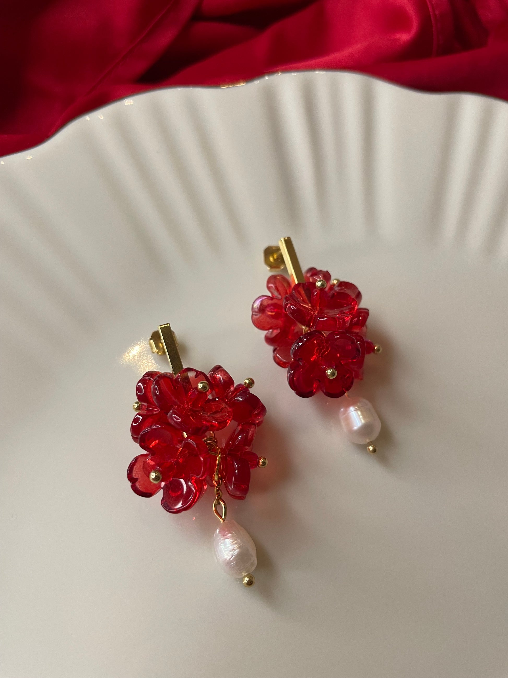 Silvia — Joulunpunaiset kukkakorvikset, joissa pienet yksityiskohdat ja aito makeanvedenhelmi viimeistelevät elegantin ilmeen.